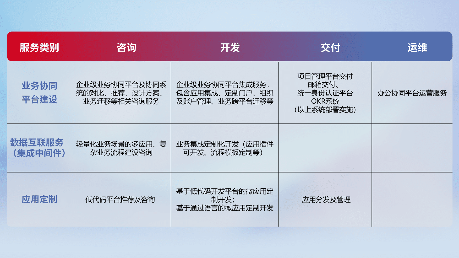 针对钉钉、、、企微、、、、IDaas等平台级产品提供产品的规划、、、、方案、、交付、、定制化开发等服务,,实现如统一协同办公、、智能客户服务、、、混合会议管理、、智能数据查询、、等业务场景,,,,实现数字化转型。。。